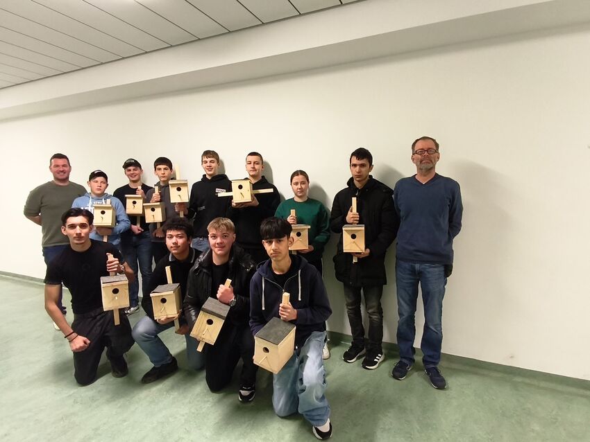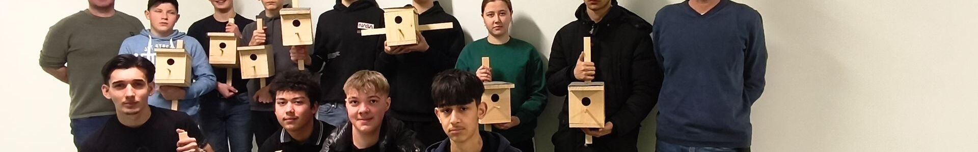 Die Technikgruppe der Mittelschule Wörth sollte in diesem Zuge "Nistkästen" aus heimischen Hölzern für heimische Vogelarten entwerfen, planen und natürlich herstellen. (Foto der stolzen Prüfungsgruppe)